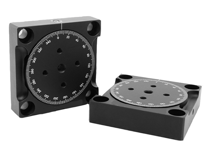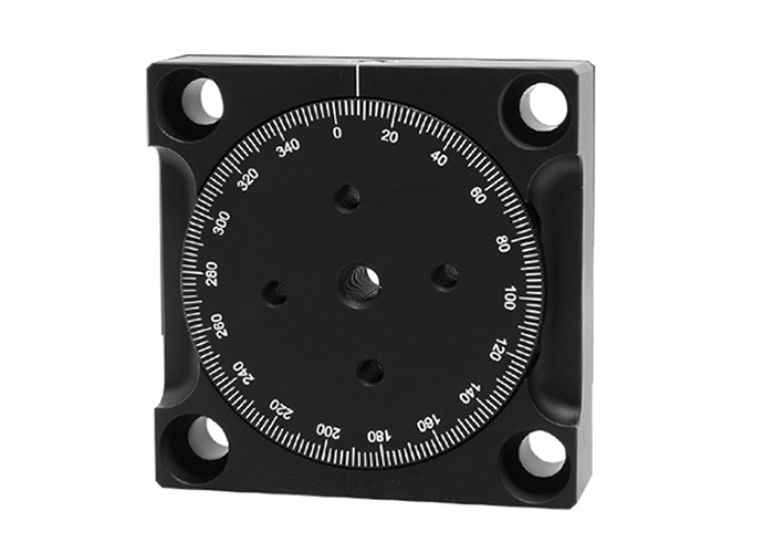 旋轉底座具有可以連續(xù)旋轉360°的臺面,非常適合需要流暢且無后沖旋轉的光機械件。臺面刻有角度刻度,間隔為2°。每20°對應的刻度線下方標記有數(shù)字,以便用戶設置臺面的角度方向。使用2.0mm六角扳手固定側面的緊定螺絲,可以鎖定平臺的旋轉。