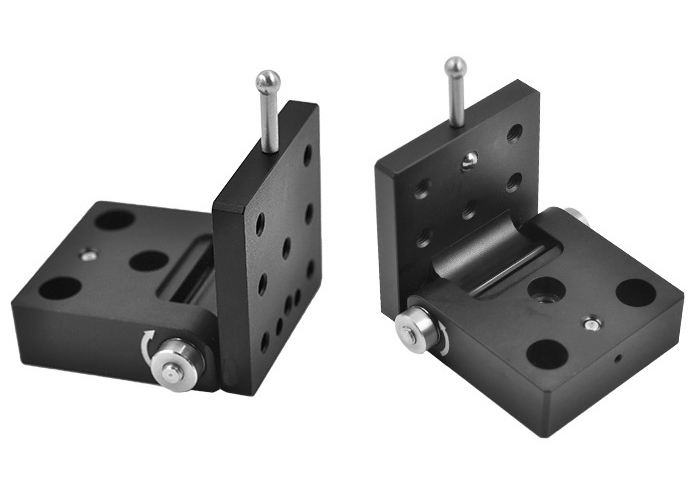 底部有5mm沉頭螺紋孔底板中心的沉頭孔安裝時(shí),頂板的角度可相對(duì)光學(xué)平臺(tái)表面在0°與90°之間切換。臺(tái)面90度翻轉(zhuǎn)起到光路切換和再現(xiàn)的功能,光路再現(xiàn)性很好。